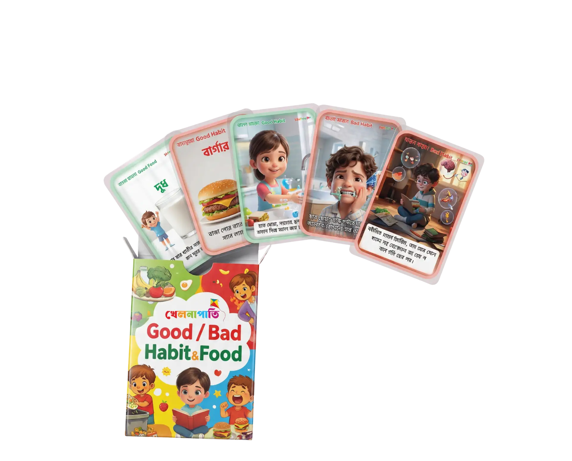 আমাদের এই কাস্টমাইজড শিক্ষামূলক ফ্ল্যাশকার্ড সেট তৈরি করা হয়েছে বাচ্চাদের ভালো খাবার, খারাপ খাবার, ভালো অভ্যাস ও খারাপ অভ্যাস সম্পর্কে ছোটবেলা থেকেই সচেতন করতে।এই ফ্ল্যাশকার্ডগুলোর মাধ্যমে শিশুরা ছবি দেখে খুব সহজেই গুরুত্বপূর্ণ বিষয়গুলো শিখতে পারবে।